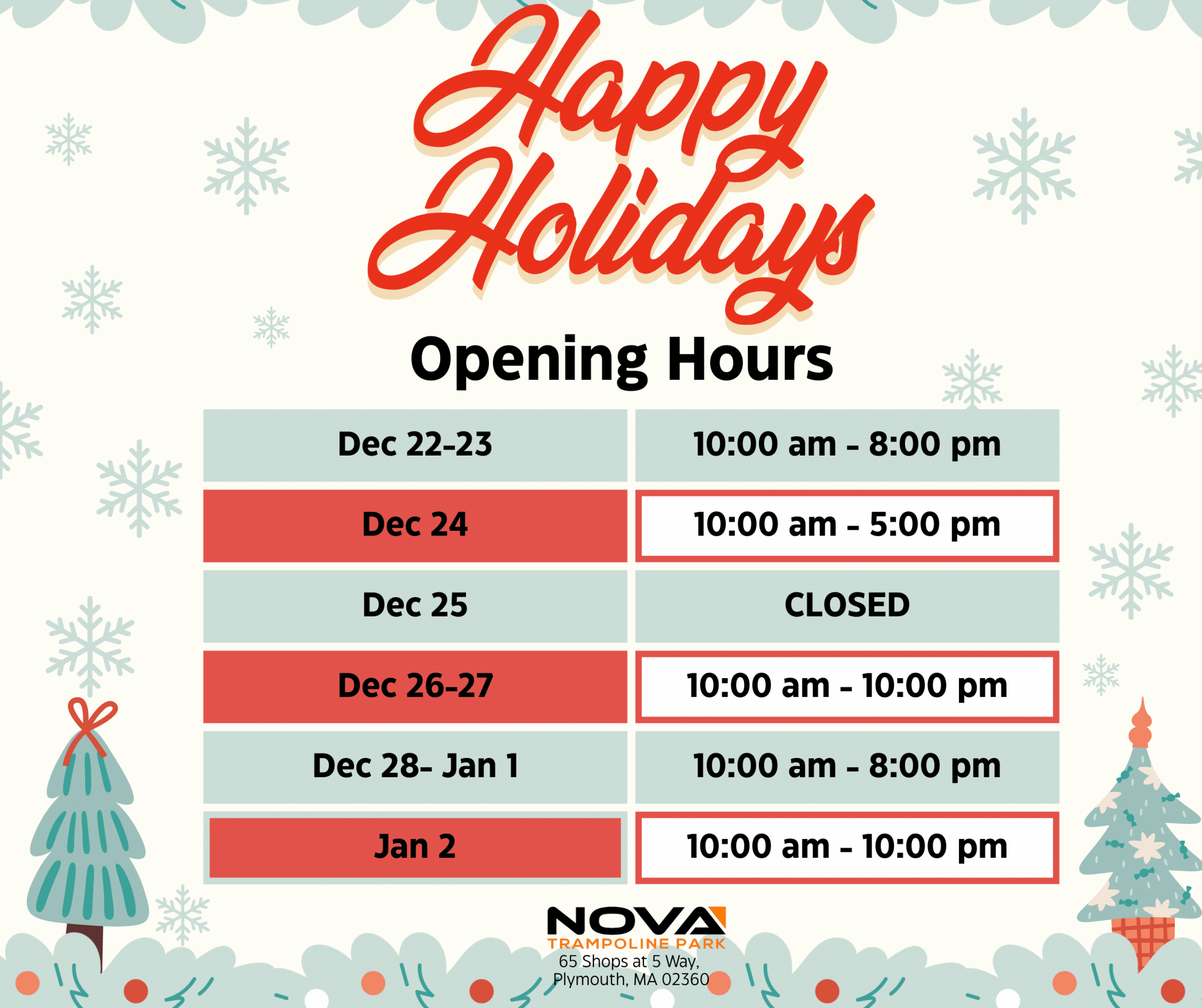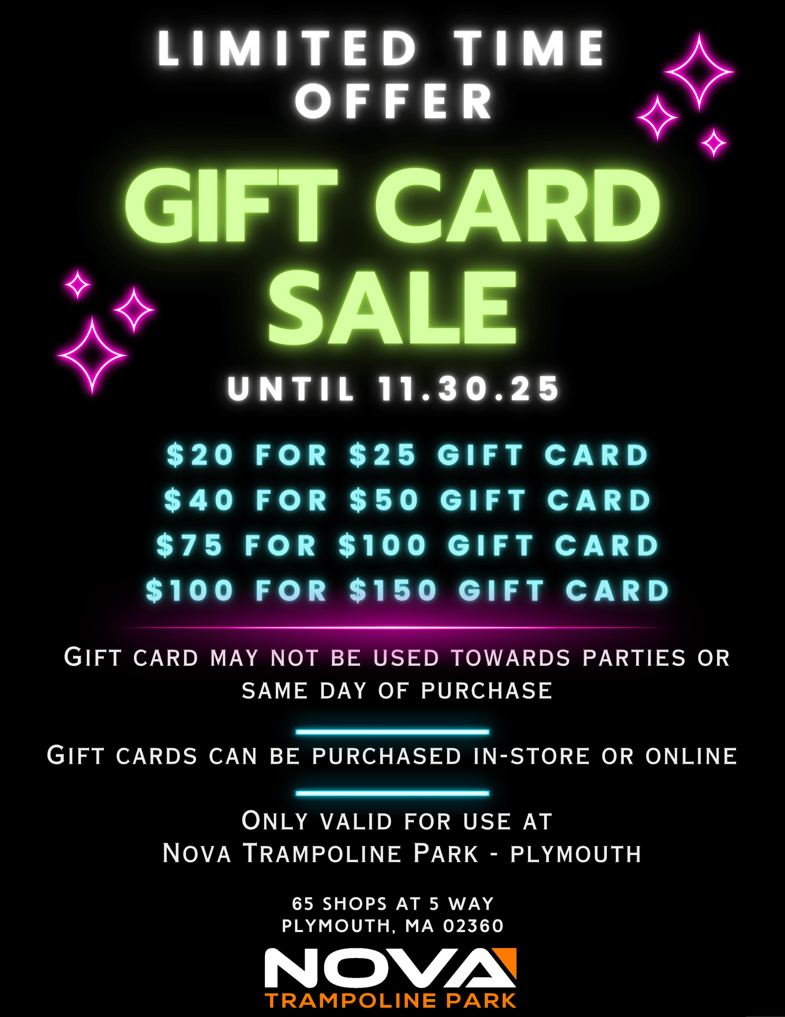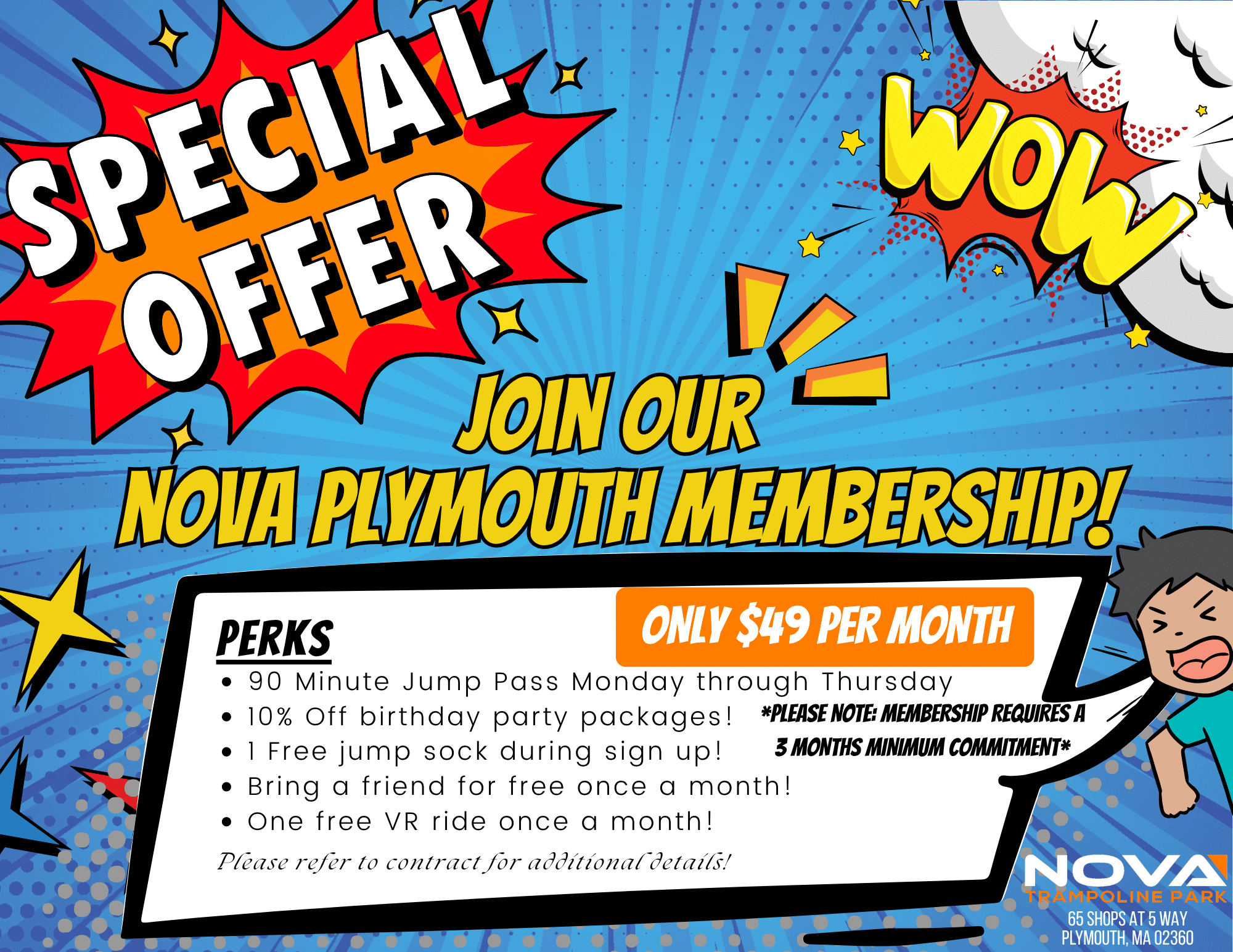 Get ready to have a great time jumping at Nova Trampoline in Plymouth, MA. Our 50,000 Square ft. facility is located in Massachusetts at 65 Shops at 5 Way in Plymouth.